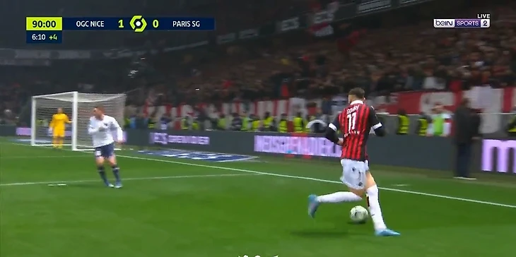 В добавленное время второго тайма «Ницца» разыграла штрафной, мяч попал к Гуири, но судья заметил какое-то нарушение и свистнул, а форвард «Ниццы» не остановился и исполнил финт «радуга».