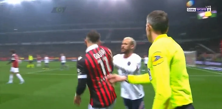 Абсолютно незначительный эпизод вызвал гнев Неймара - бразилец подбежал и толкнул Гуири, после чего между ними встал лайнсмен.