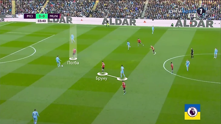 Ключевой в этом плане была именно роль Бруну и Погба. В прессинге они не действовали как связка, а делили обязанности. Один (как правило, Бруну) выдвигался на центральных защитников «Сити», другой (как правило, Погба) – действовал по опорнику Родри: