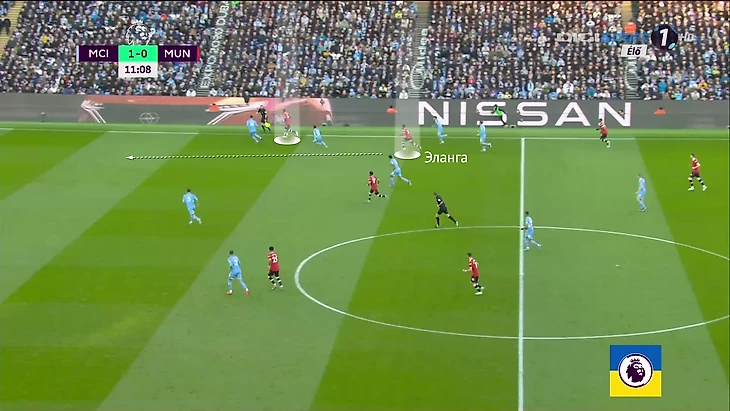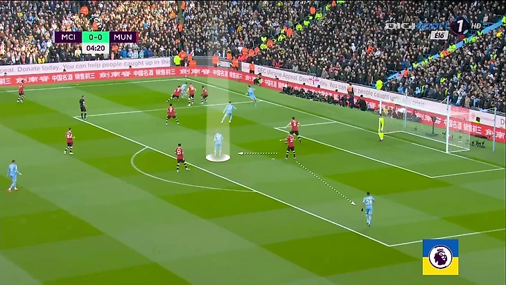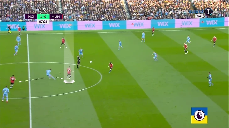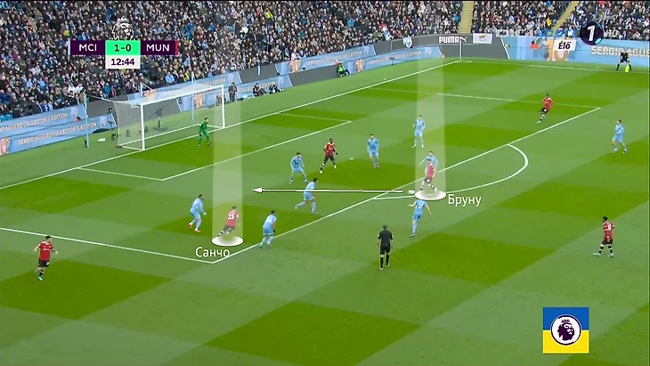 В этом эпизоде заставил разрываться Стоунза – тому нужно решать, выдвигаться до конца за соперником или оставаться в зоне (туда уже готов врываться Джейдон Санчо). Оптимального решения Джон не нашел – успел восполнить пробел в линии, но дал свободу Бруну. Тот развил атаку «МЮ»: