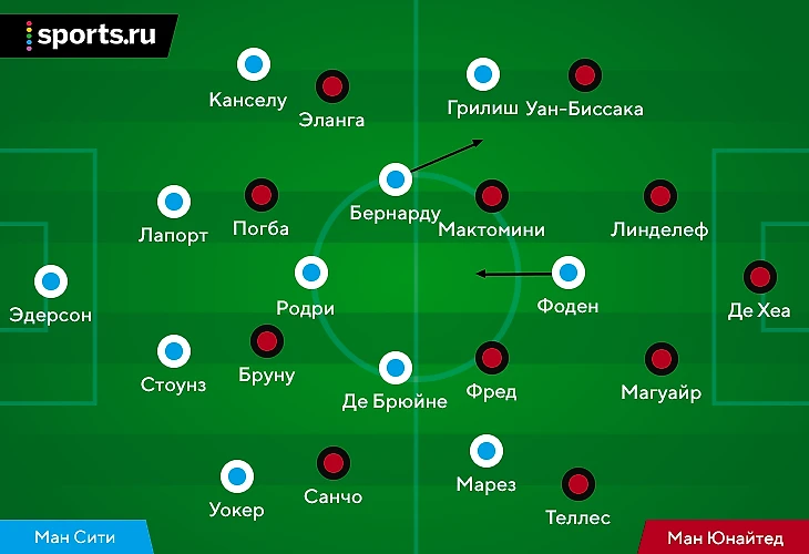 Гвардиола заменил Диаша напрямую – позицию правого центрального защитника занял Джон Стоунз (уже не основной, как в прошлом сезоне). Поиски Ральфа Рангника привели к более интересным раскладам. В теории тренер «МЮ» мог выпустить в основе Маркуса Рэшфорда (в плохой форме, но может быть полезен против высокой линии «Сити»), но в итоге придумал сенсационный вариант с Бруну Фернандешем и Полем Погба в нападении. Это не новинка даже для дерби Манчестера (в прошлом сезоне Пеп выставлял впереди Бернарду и КДБ), но от Рангника это был прямо-таки сюрприз.