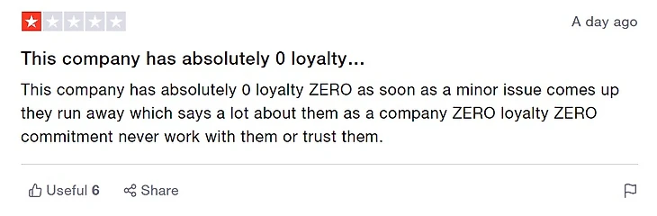 «У этой компании абсолютно нет лояльности, как только возникает незначительная проблема, они убегают, что много говорит о них как о компании. Никогда не работайте с ними и не доверяйте им»