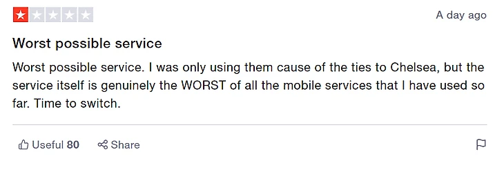 «Худший сервис из всех возможных. Использовал их только из-за связей с «Челси», но сам сервис действительно ХУДШИЙ из всех, которыми я пользовался до сих пор. Время переключаться».