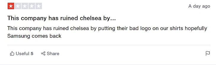 «Эта компания испортила «Челси», разместив свой ужасный логотип на наших футболках, надеюсь, «Самсунг» (предыдущий титульный спонсор) вернется»