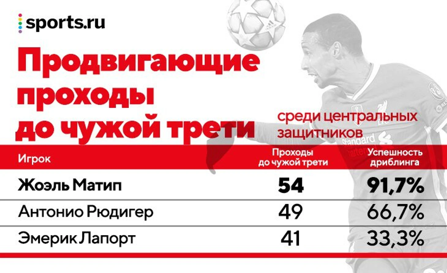 Без мяча Матип обладает всеми качествами, чтобы играть в высокой линии прессингующей команды. С мячом у него тоже нет явных слабостей, зато есть четкая суперсила – проходы до чужой трети/штрафной.