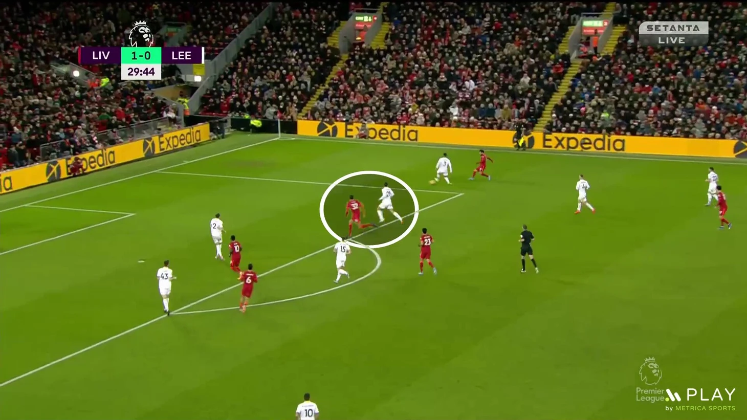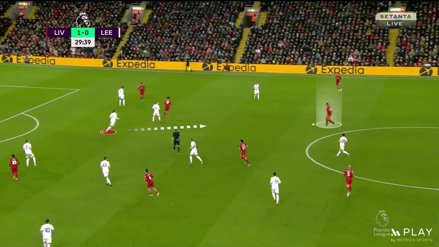 Матч против «Лидса», который прямо страдал от проходов Матипа и в первом, и во втором круге. Жоэль получает пространство и двигается с мячом – центральный защитник Паскаль Стрейк выдвигается, реагируя на движение Матипа: