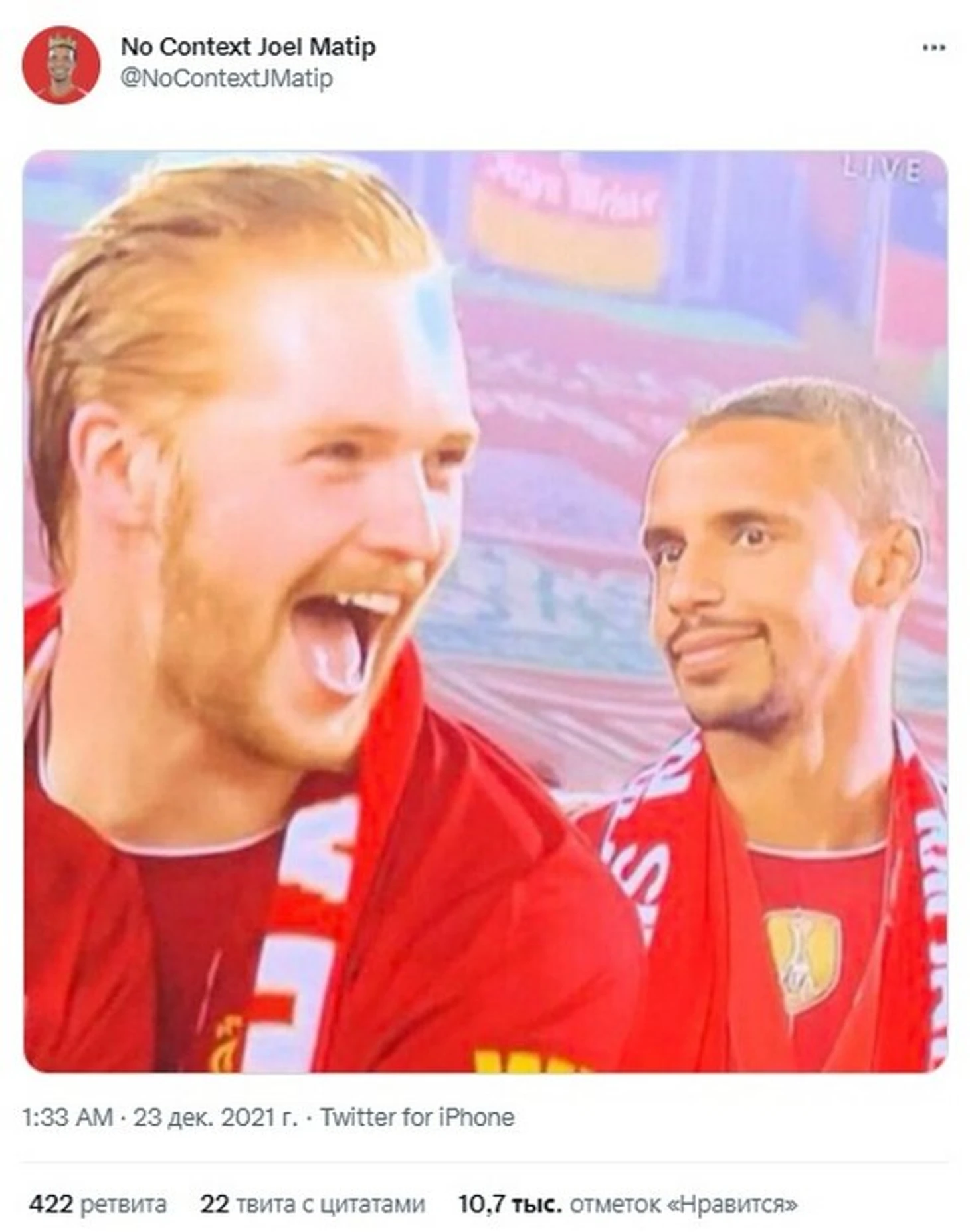Матипа нет в соцсетях, зато в твиттере есть целый аккаунт, посвященный ему одному – No Context Joel Matip. Там делятся забавными моментами с участием Жоэля. На страницу подписаны Алиссон, Ван Дейк и еще 137 тысяч человек. Вы тоже можете – вот вам еще одна причина поставить VPN.