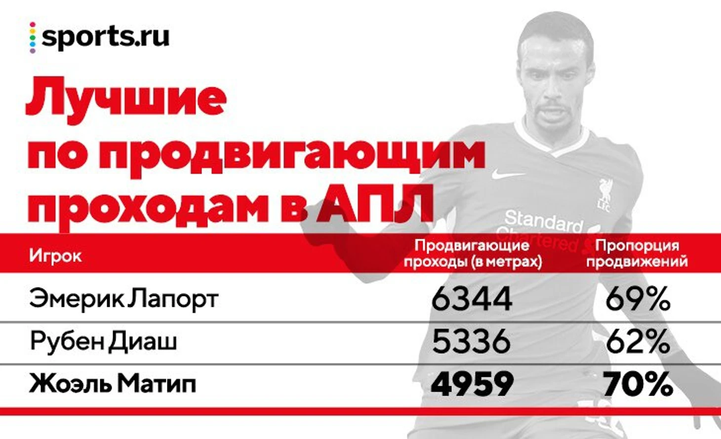 Матип в этом плане выделяется на фоне всей лиги. Продвигающие проходы – параметр, который косвенно отражает это качество. На дистанции сезона в таких проходах Матип уступает только двум защитникам «Ман Сити» – команды, которая еще больше времени проводит с мячом, что дает некоторую фору. При этом пропорция продвижений у Матипа выше, чем у конкурентов: