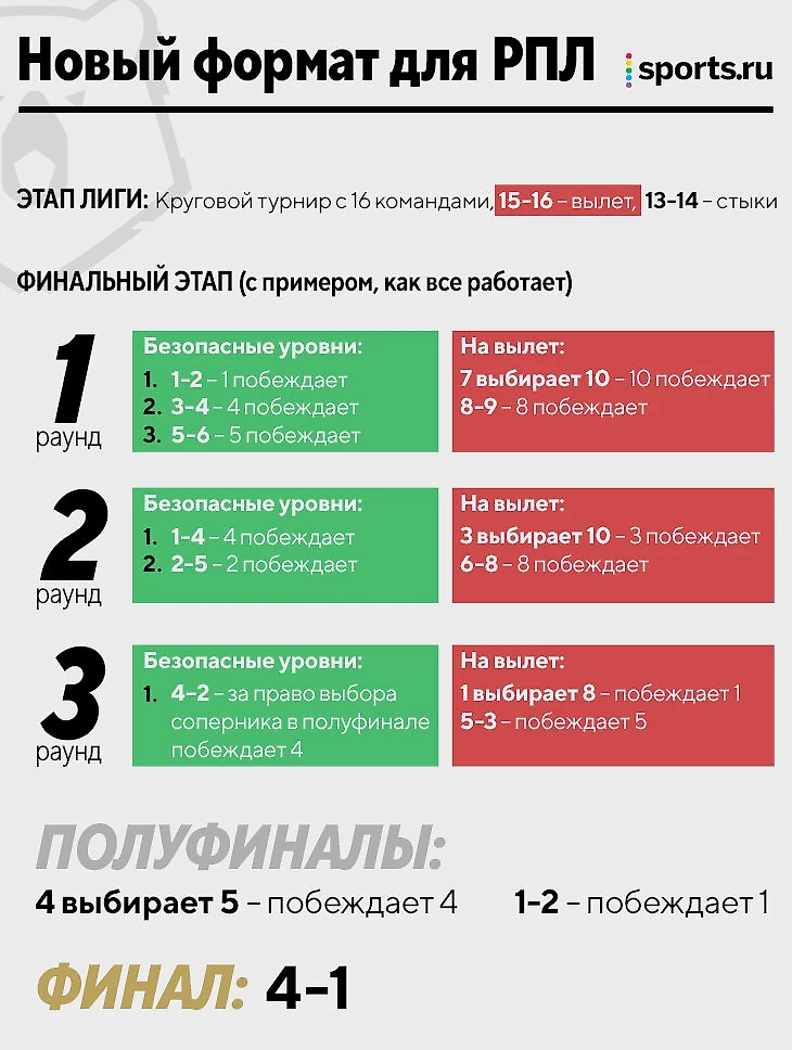 Можно чемпионскую четверку расширить до 6 команд – тогда вместо 12 топ-матчей получим 30. Можно убрать возню низов за спасение: по итогам сезона выкидывать 16-е место, а 15-е отправлять в стыки.