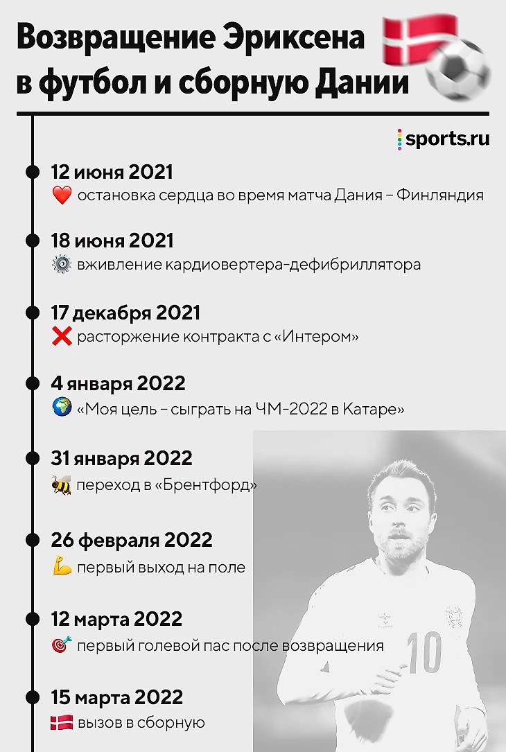 Вы точно помните главное, что происходило с игроком: «Интер» разорвал с ним контракт, потому что не мог выпускать игрока со стимулятором по местным правилам, перед переездом в «Брентфорд» Кристиана досконально исследовали, было в том числе разрешающее заключение кардиолога и отдельное позволение футбольных властей – пока все это организовывали, Эриксен тренировался с молодежкой «Аякса».