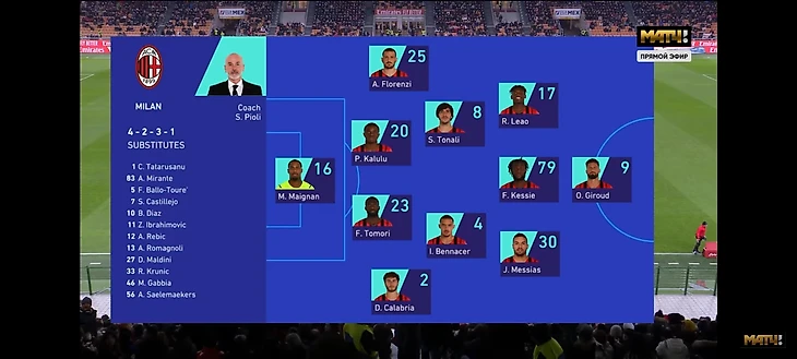 Милан вышел на поле со своей привычной схемой 4-2-3-1. На острие атаки вышел восстановившийся после незначительной травмы Оливье Жиру. Выбор вингеров Милана хоть и довольно велик, но он не удивил. Ими стали Мессиас Джуниор справа и Рафаэль Лесу слева. Но небольшой сюрприз преподнесло решение Стефано Пиоли поставить Франка Кессье атакующим полузащитником, а Браима Диаса оставить на скамейке запасных. Двумя опорниками стали Исмаэль Беннасер и Сандро Тонали, тоже немного неожиданное сочетание, но они довольно гармонично смотрелись во время матча. В защите было довольно стандартное при травме Романьоли и Кьяера сочетание Томори и Калулу. На флангах обороны были Флоренци и Калабрия, Тэо Эрнандез этот матч пропускал из-за перебора жёлтых карточек. На воротах был Майк Меньян.