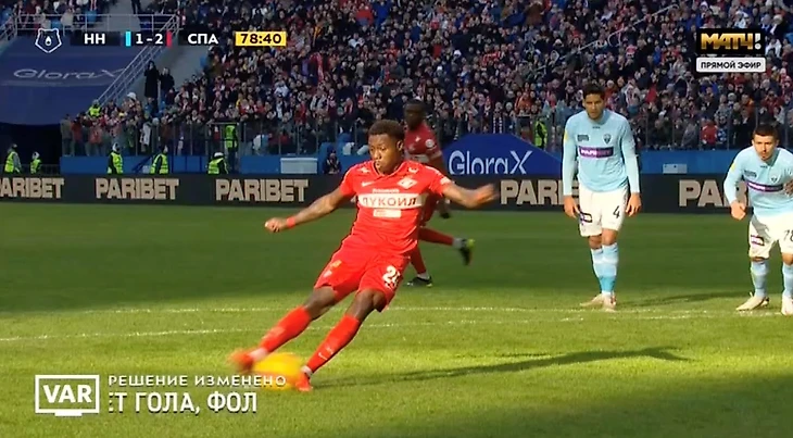 Очень сложный матч провел «Спартак». С большим количеством единоборств, противостоял упорному в борьбе сопернику, который хотя и отдал мяч гостям, но при первой возможности старался идти в контратаку. Правда, первый тайм в целом оказался неинтересным. Опасных моментов нет, много беготни и еще больше – ошибок в передачах. Впрочем, нет. Какоев ближе к перерыву остался один на один с Селиховым, бил в падении и головой угодил во вратаря! Тогда спартаковцам просто повезло. Но судьба отыгралась на них во втором тайме, когда Промес бил пенальти, назначенный за ошибку защитников на Мозесе в штрафной площади. И тут произошел редчайший случай. Промес попал поначалу в свою левую ногу, мяч по странной траектории полетел в ворота и гол? Нет, ВАР заметил нарушение правил, и Иванов назначил свободный удар от ворот хозяев.