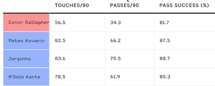Приведенная выше статистика показывает, что Конор намного реже действует с мячом в этом сезоне, чем это делает текущая полузащита «Челси».