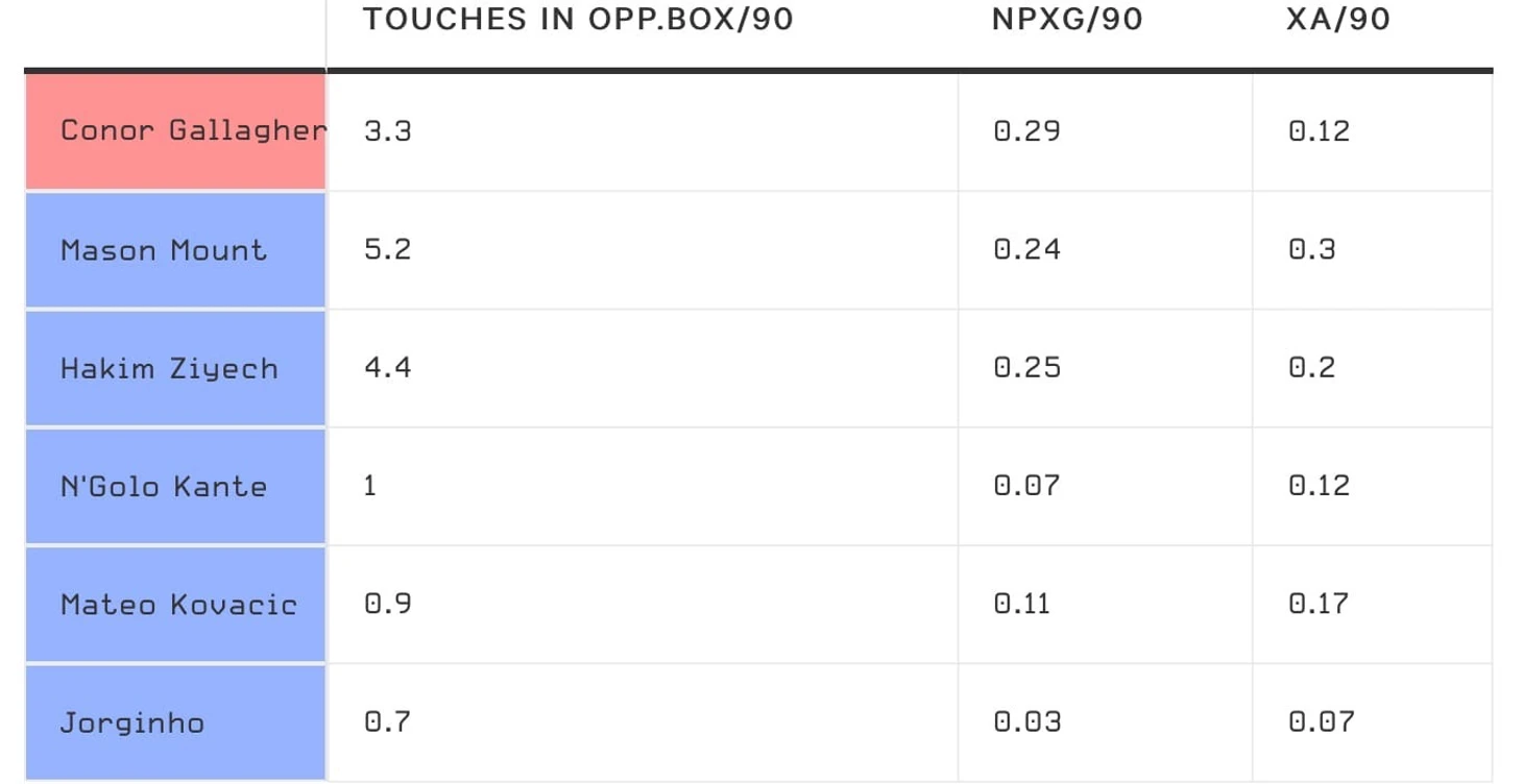 При чём, он значительно превосходит нынешнюю полузащиту «Челси» по касаниям в чужой штрафной и статистике ожидаемых голов, имея показатели близкие к игрокам атакующей линии.