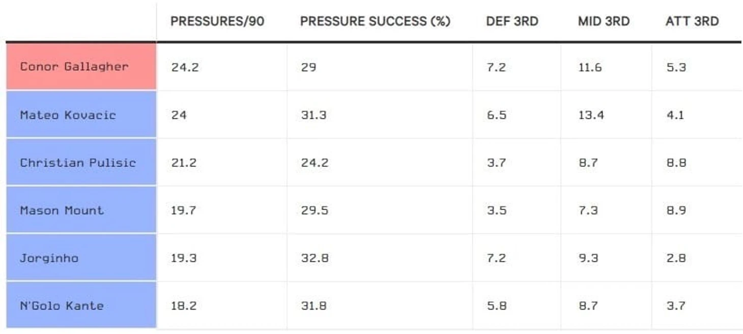 Ситуация с Конором, конечно значительно отличается от многих полузащитников «Челси». Во-первых, даже если взглянуть на показатель прессинга, а он необходим при футболе Тухеля, Галлахер ничем не отступает от показателей основы синих.