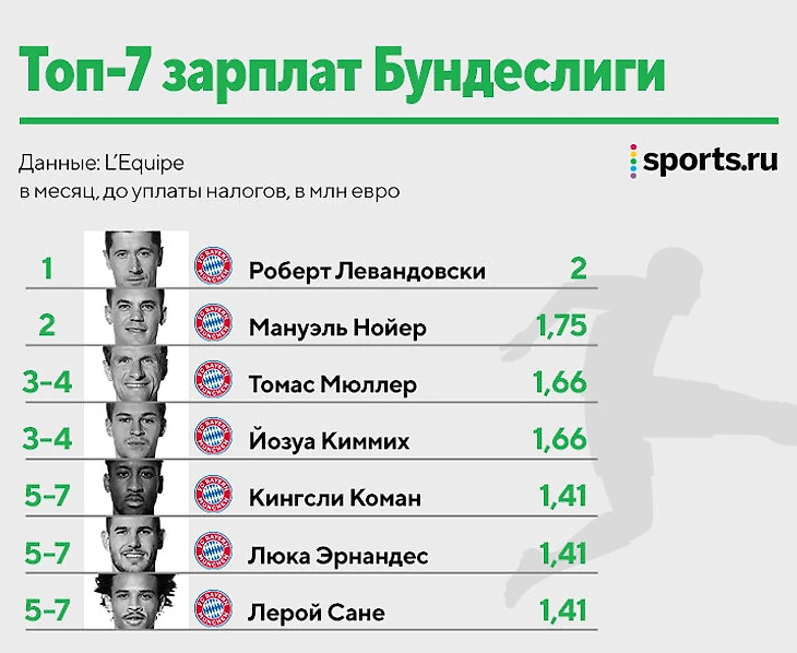 • В Германии все стабильно. Роберт Левандовски заслуженно в лидерах – 2,5 млн евро в месяц. За ним идут партнеры по команде. Весь топ-5 – из «Баварии».