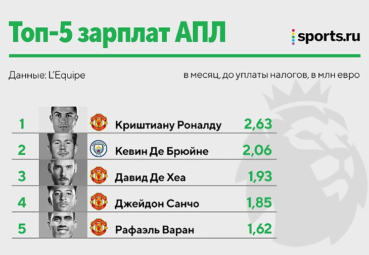 • В АПЛ весь топ-5 состоит из манчестерских клубов – преимущественно из «Юнайтед». От «Ман Сити» вошел только Кевин Де Брюйне (2 место, 2,06 млн евро в месяц).