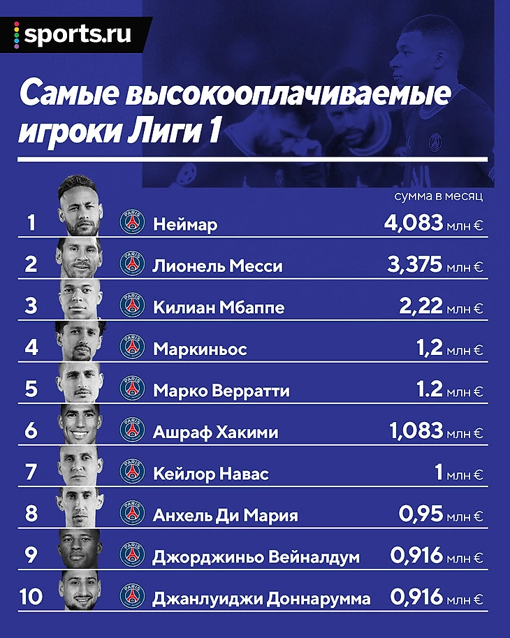 • Больше всех в лиге получает Неймар – 4,083 млн евро в месяц. В мае бразилец продлил контракт с «ПСЖ», и его зарплата поднялась еще сильнее – в прошлом году тот же L’Equipe писал, что он получает 3,06 млн евро.