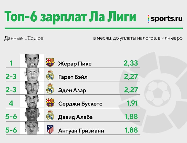 • Быстро пройдемся по остальным: в топ Ла Лиги вернулся Гарет Бэйл (2,2 млн), а Эден Азар замыкает тройку. Дальше – Серджи Бускетс, приехавший свободным агентом Давид Алаба и уже упомянутый Гризманн.