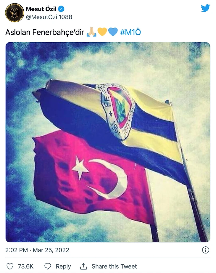 Сам Озил сначала никак на это не отреагировал, зато сегодня выложил картинку с флагами Турции и «Фенербахче» и подводкой «Главное – «Фенербахче».