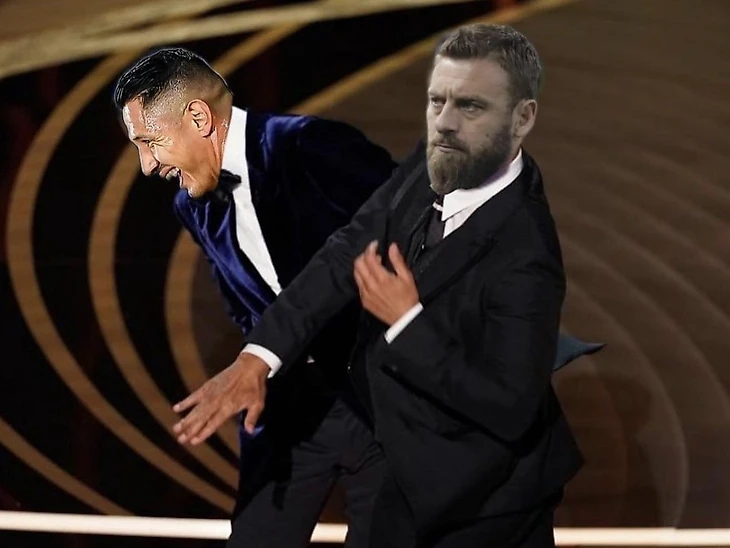 В интернете уже уйма мемов о скандале, который произошел на «Оскаре» этой ночью. Один из таких опубликовал фанатский аккаунт «Ромы» – на картинке вместо Смита и Рока изображены легенда клуба Даниэле Де Росси и Джанлука Лападула. В 2017-м Де Росси получил бан на два матча за то, что ударил нападающего «Дженоа».