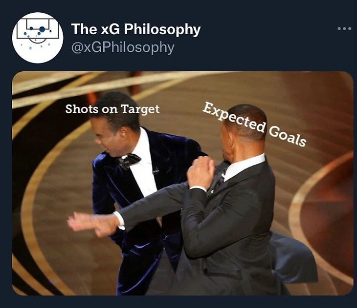 Момент добрался даже до футбольной аналитики – казалось бы, максимально далекой от «Оскара» и скандалов. На картинке ниже – xG в роли Смита и удары в створ в роли Рока.