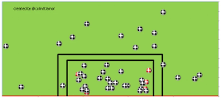 «Лучший мем по мотивам Оскара! Давно хотел написать, почему удары в створ – бесполезный показатель, но это прямо очень хороший тизер. Валерий Карпин не очень котировал xG на Матче, но донес похожую мысль в «Тотальном разборе» (вместо xG были голевые моменты). Мой любимый пример бесполезности ударов в створ – сравнение Рафы ван дер Варта и Дарио Цвитанича в сезоне-2012/13 (первый был в «Гамбурге», второй в «Ницце»). У обоих почти идентичное количество ударов (61 на 58), равенство п ударам в створ (по 29), но пугающая разница в голах (ВДВ – 5, Цвитанич – 19). Тот пример фиксирует сразу две проблемы с ударами в створ: 1. Пробить в створ можно с разных позиций: у ВДВ 56% ударов были из-за пределов штрафной, у Цвитанича – всего 31%. 2. Можно по-разному пробить по створу – неопасно по центру (вероятность гола – 12%) или опасно в угол (вероятность гола – 50%). Вот карта ударов Ван дер Варта...