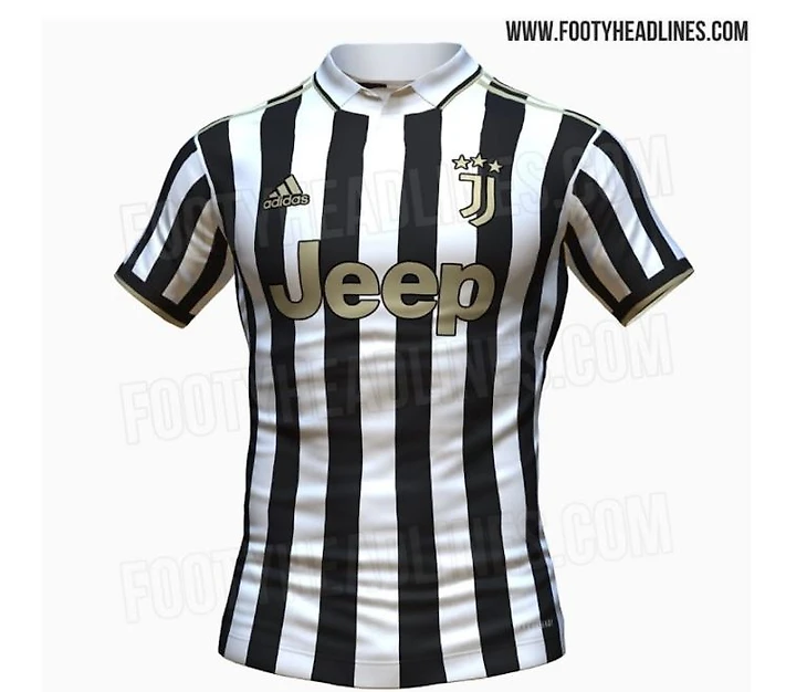 Новая домашняя форма «Ювентуса» может быть украшена воротником-поло и золотыми деталями, включая гербы клуба и Adidas, главного спонсора Jeep и классические полоски Adidas на плечах.