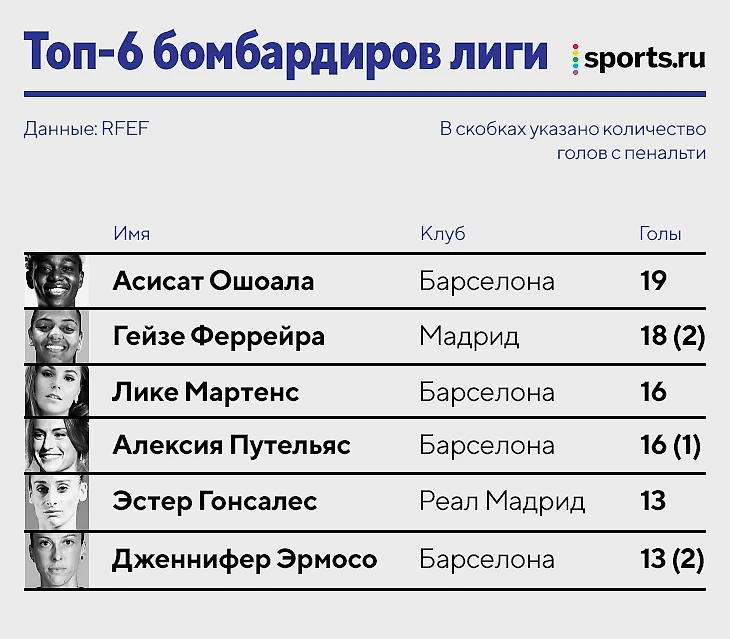 Похожая ситуация в топе лучших ассистентов – четыре первых строчки у футболисток «Барсы». Возглавляет его, кстати, Алексия Путельяс – действующий обладатель «Золотого мяча».