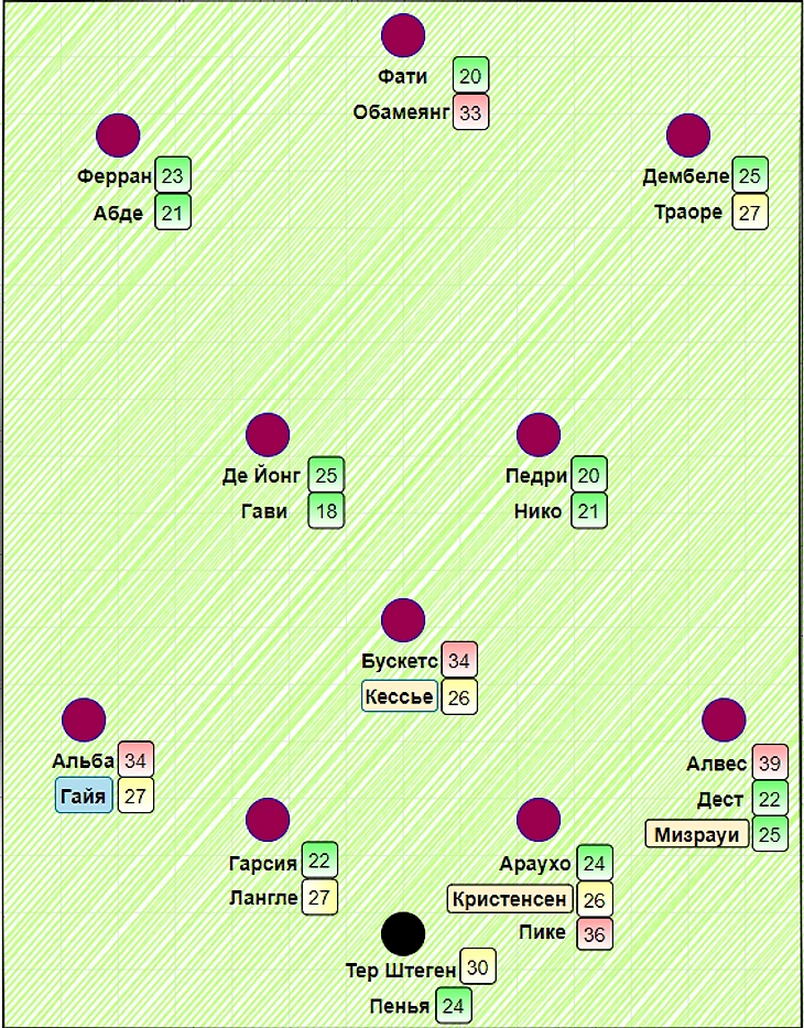 На каждой позиции на поле будут 2-3 футболиста. Первым указан тот, кому я отдаю предпочтение на конкретной позиции. Справа от имени показано, сколько лет будет игроку в сезоне 22/23. Отдельными цветами выделены футболисты, которых Барса может подписать (или подписала) в качестве свободного агента или купить этим летом.