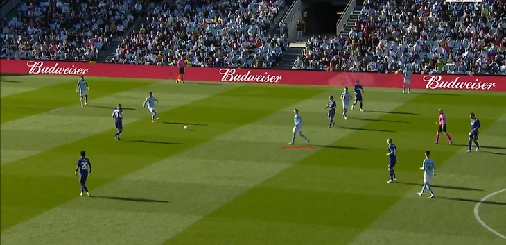 В стадии владения у Сельты высокого поднимались крайние защитники, опорник Фран Бельтран опускался в линию защиты для продвижения мяча, а Яго Аспас играл в привычной свободной роли. Аспас отвечал как за продвижение мяча из глубины, так и за созидание в финальной трети соперника. Аспас по-разному угрожал обороне Реала. Вот тут, например, он забежал за спину Алабе, приняв передачу из глубины.