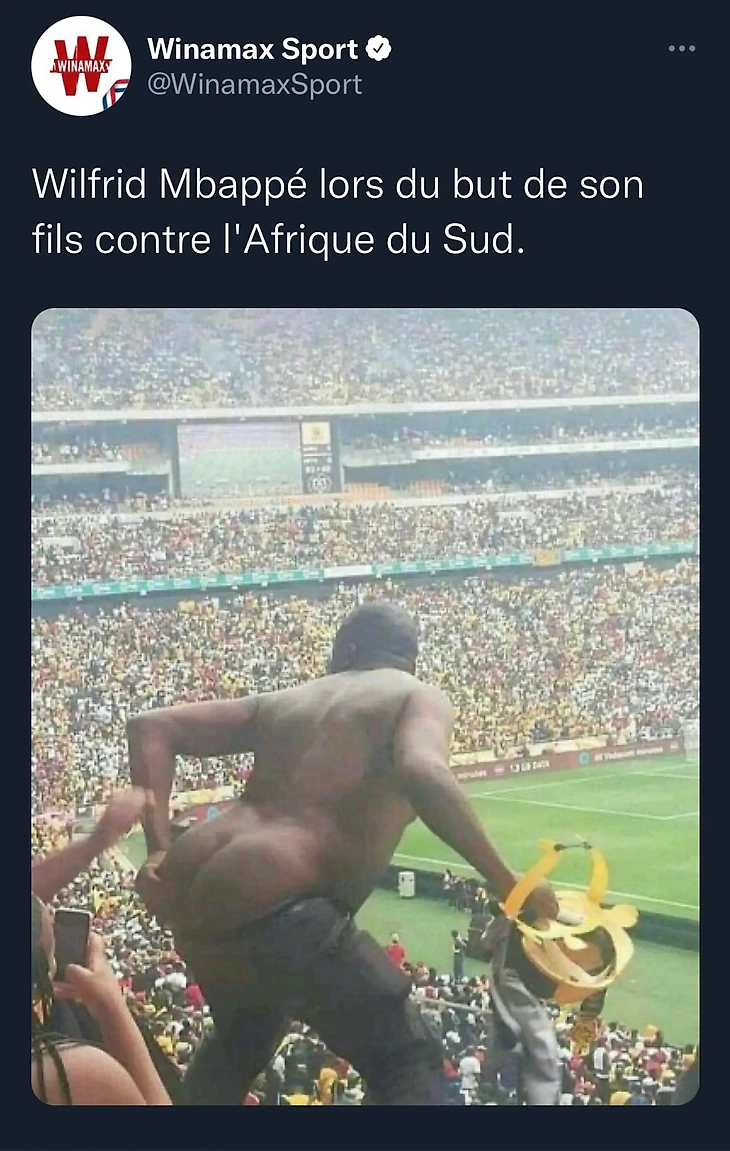 В профиле букмекера появилось фото болельщика на трибуне с голым задом. Подпись: «Уилфрид Мбаппе во время гола своего сына в ворота Южной Африки».