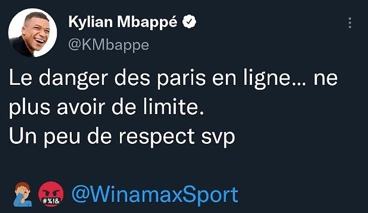 Мбаппе, конечно, счел это оскорбительным и написал: «Опасность онлайн-ставок… Они не знают границ. Немного уважения, пожалуйста».