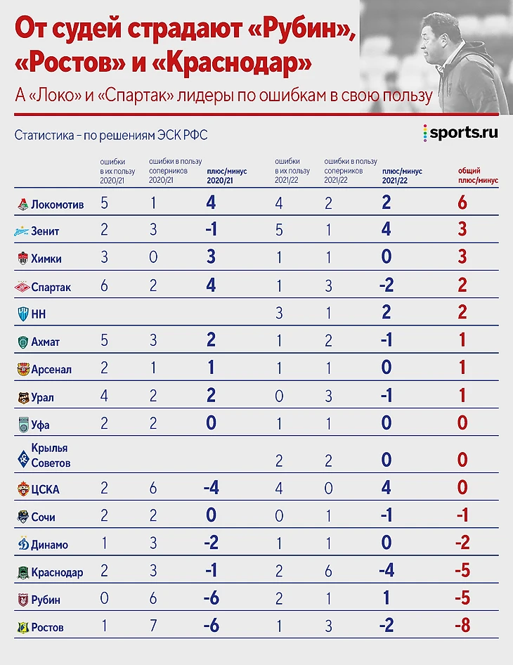 • «Локомотив», наоборот, два сезона подряд среди лидеров по ошибкам в его пользу. Однако непосредственно в этом сезоне красно-зеленые уступают по этому показателю «Зениту» и ЦСКА. Армейцы вообще единственная команда, против которой ни разу не ошибались.