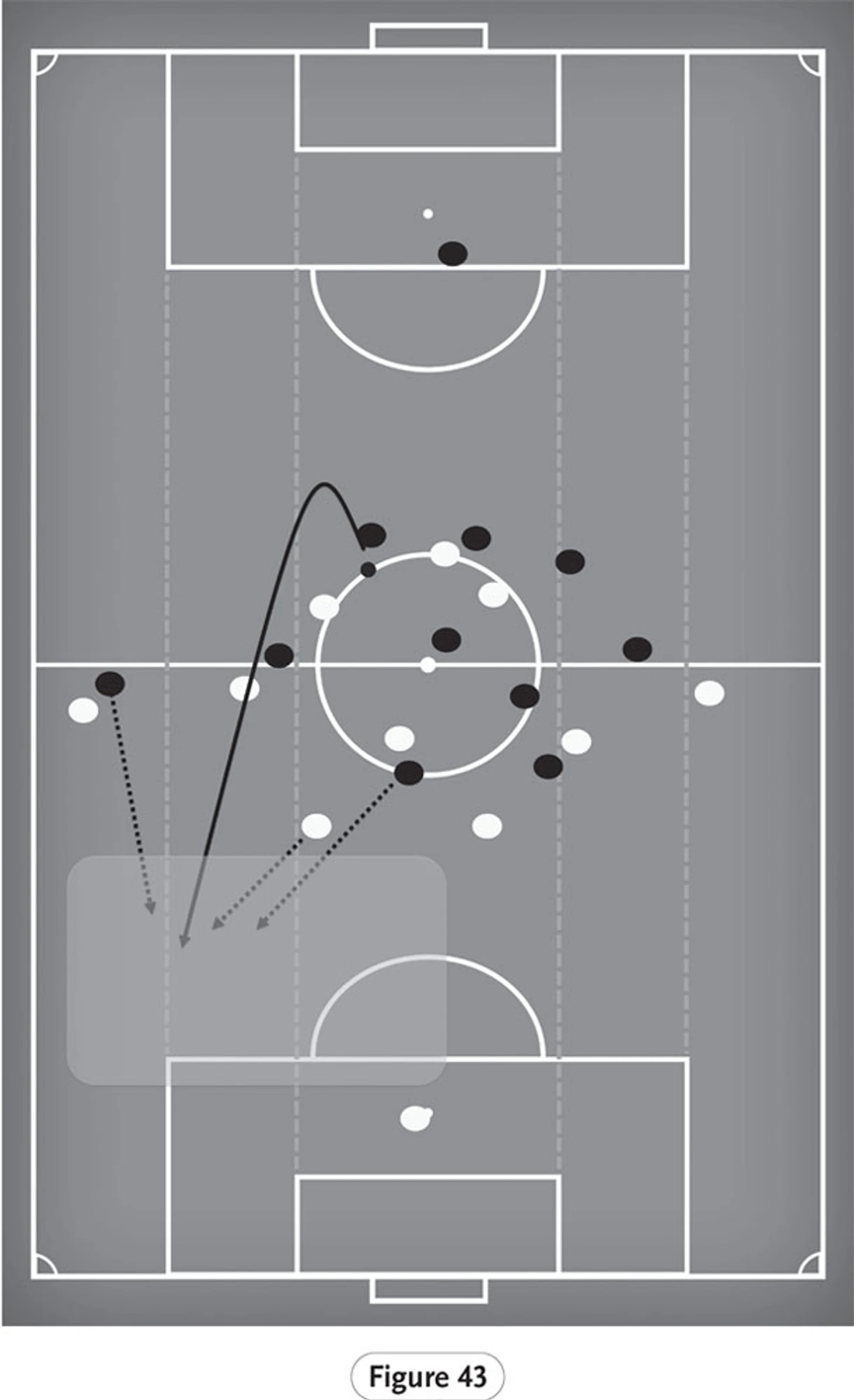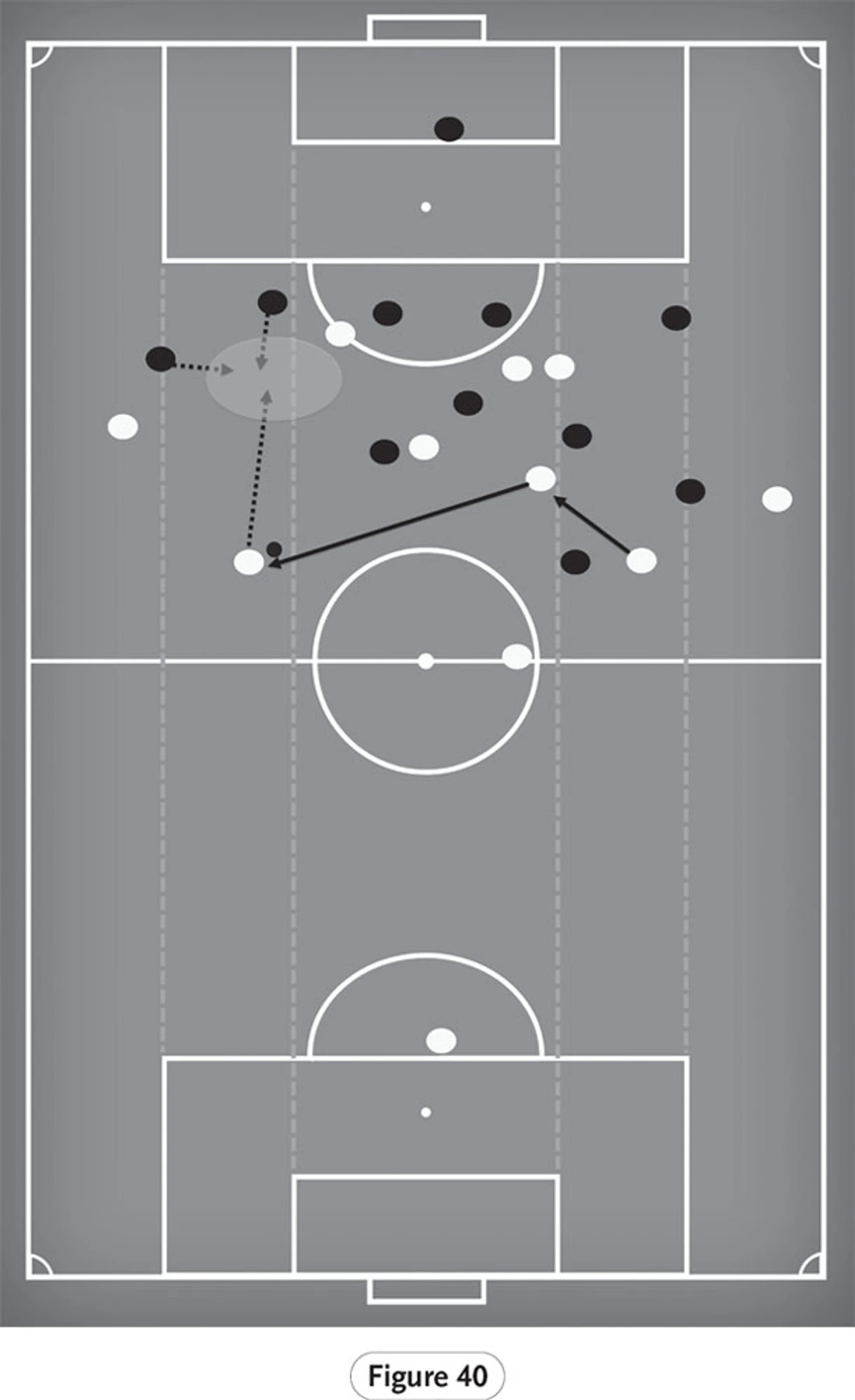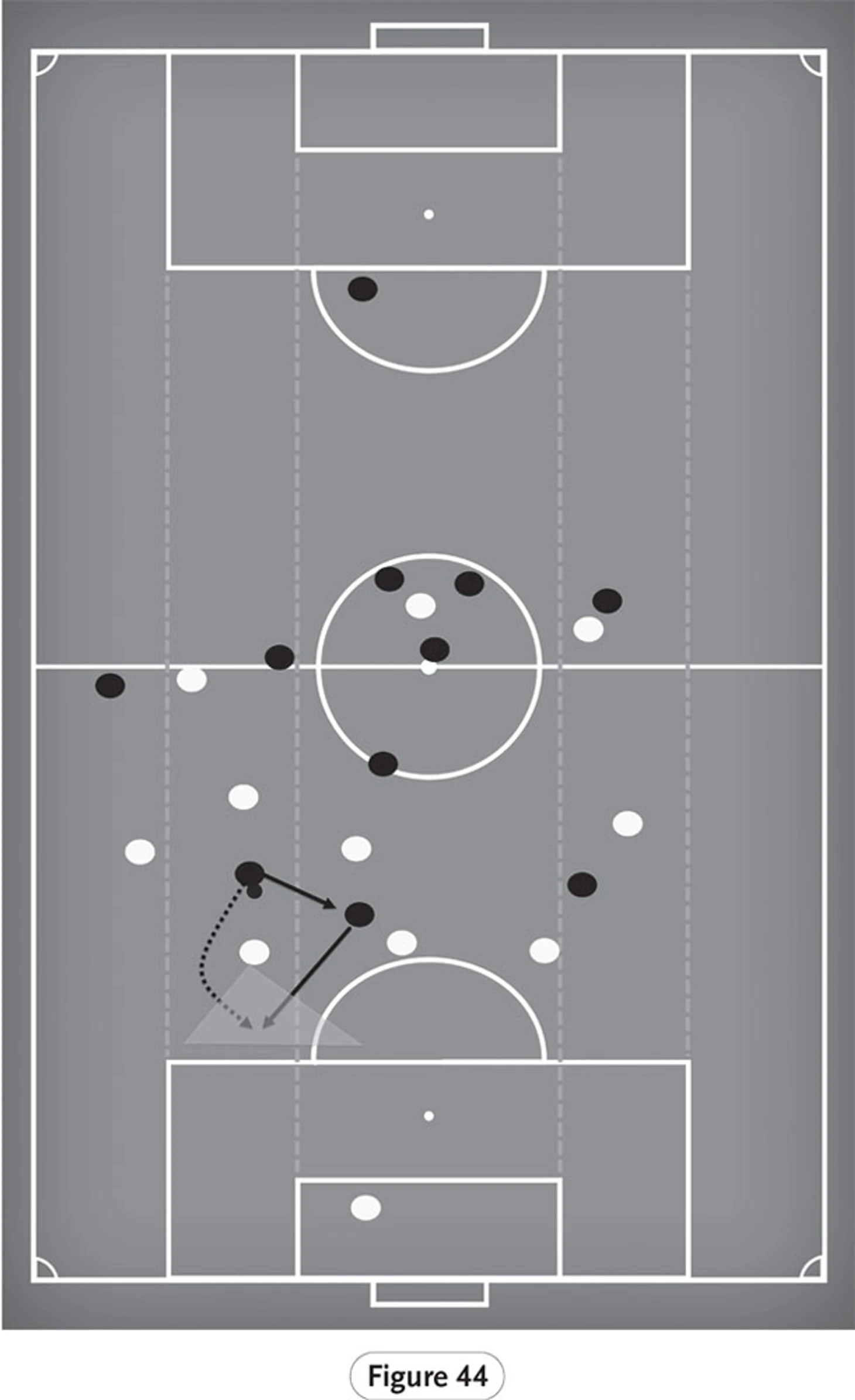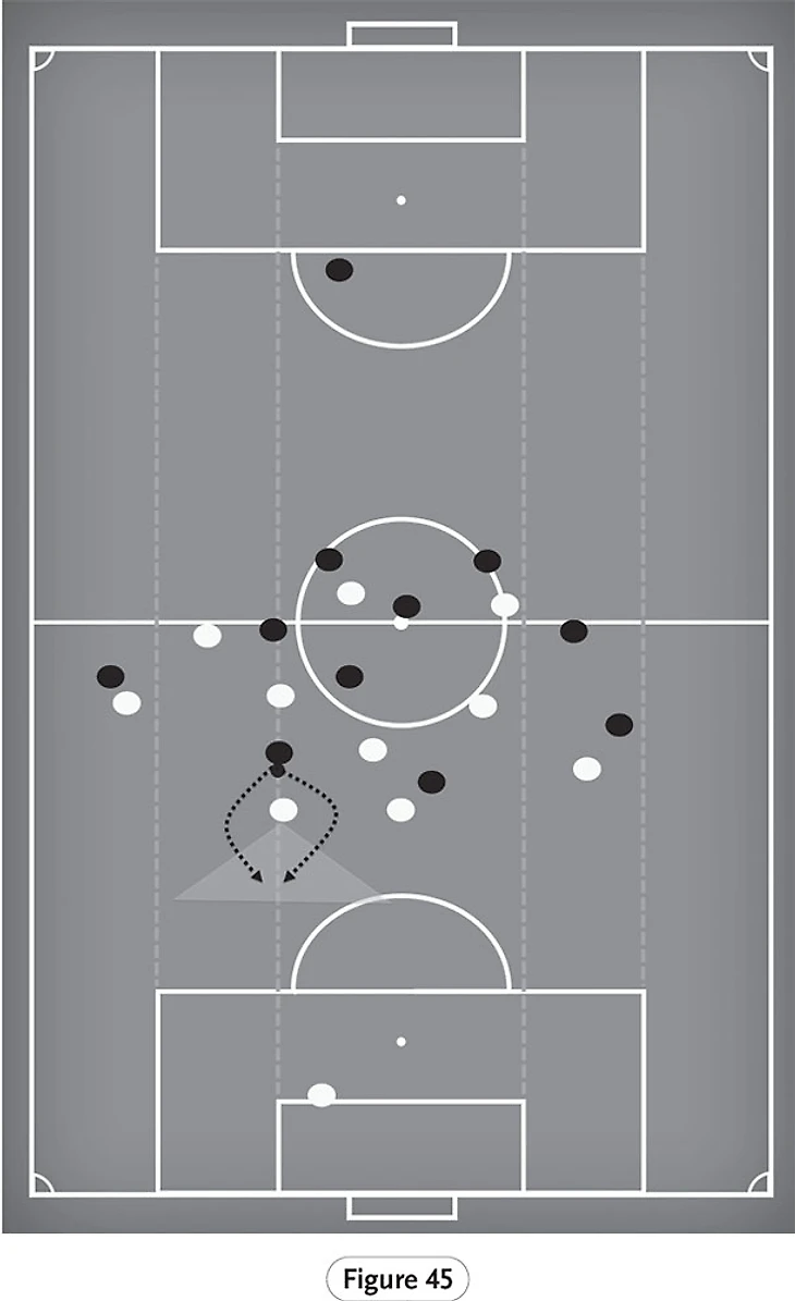 Мы видим наглядный пример такого баланса и способности защищаться в одиночку на рисунке 45, когда нападающий соперника с мячом и снова находится прямо перед голландским защитником. Второй центральный защитник не может обеспечить эффективное прикрытие из-за позиции второго нападающего.