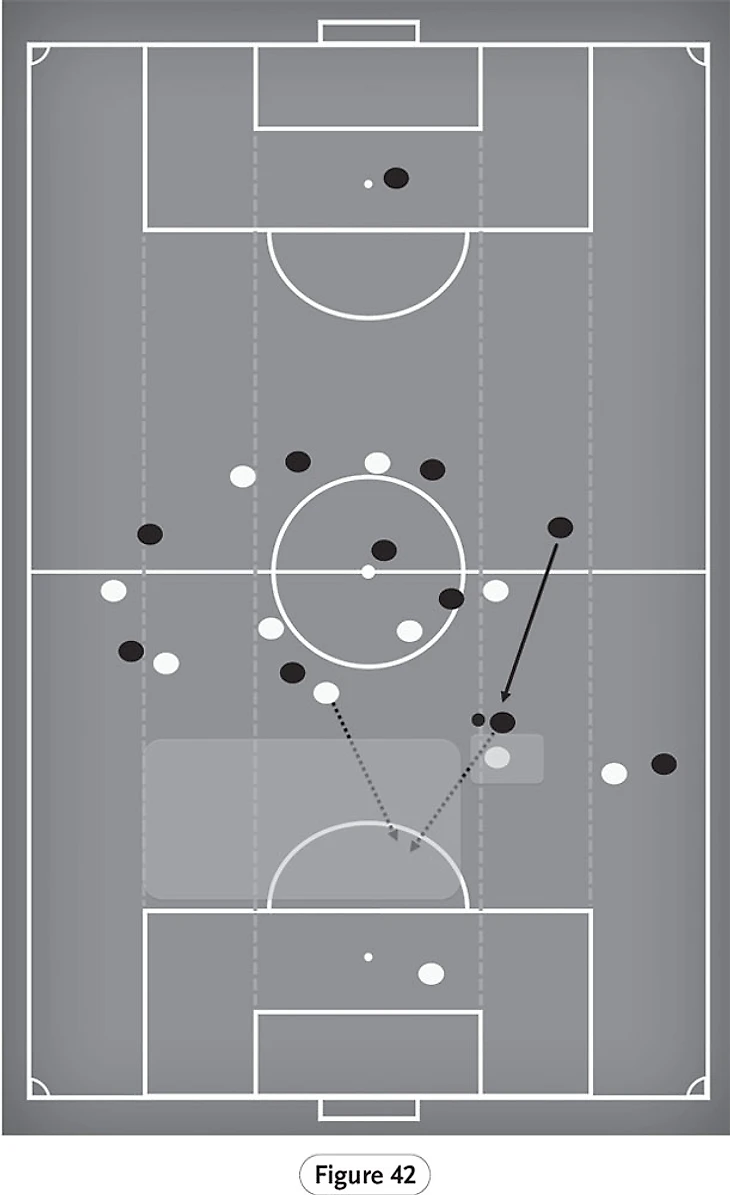 Мы также, конечно, должны учитывать способность Ван Дейка действовать в оборонительной фазе. Это ситуация из матча сезона 2019/20 против Шпор, и мы выделили ключевой момент на рисунке 42. Когда Шпоры перешли в фазу атаки, мяч оказался у них в правом полупространстве, но «Ливерпуль» все еще сохранял контроль. Так продолжалось до тех пор, пока защитник, прикрывавший владеющего мячом игрока, не потерял равновесие, и внезапно владеющий мячом игрок, вышел к воротам.