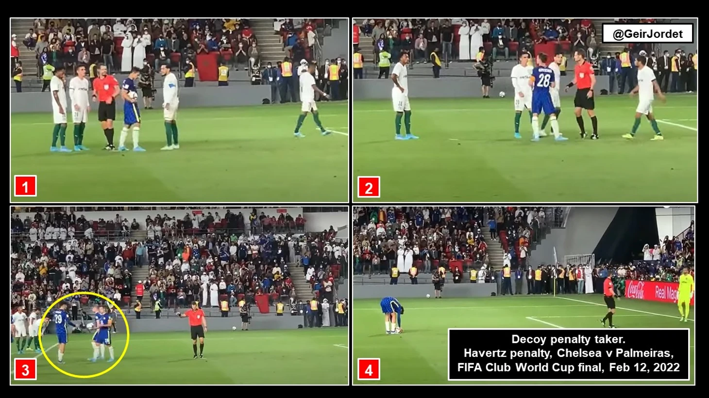 5. «Ложный пенальтист». В финале клубного чемпионата мира Аспиликуэта блестяще исполнил роль бьющего, чтобы привлечь внимание соперников, в то время как Хаверц спокойно ждал в стороне. В последнюю секунду пенальтистом стал Хаверц. Способ наиболее эффективен, когда бьющий изначально неизвестен. Эту тему уже применили и в других чемпионатах.