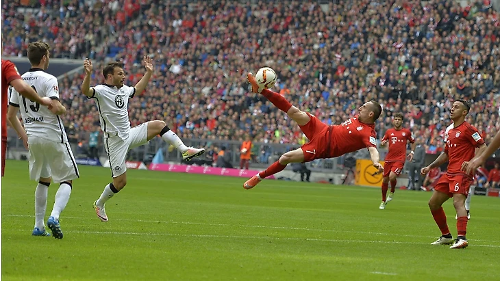 Если Bundesliga когда-либо понадобится новый логотип, Рибери, возможно, предложил идеальный шаблон для єтого. В матче против EINTRACHT 2 апреля 2016 года после отражения франкфуртским вратарем Лукашем Градецки француз реагирует и боковыми ножницами высокий мяч красивым, самым красивым, ударом забил единственный гол. Тренер Гвардиола(Guardiola) и зрители на Альянс-Арене взорвались радостью.