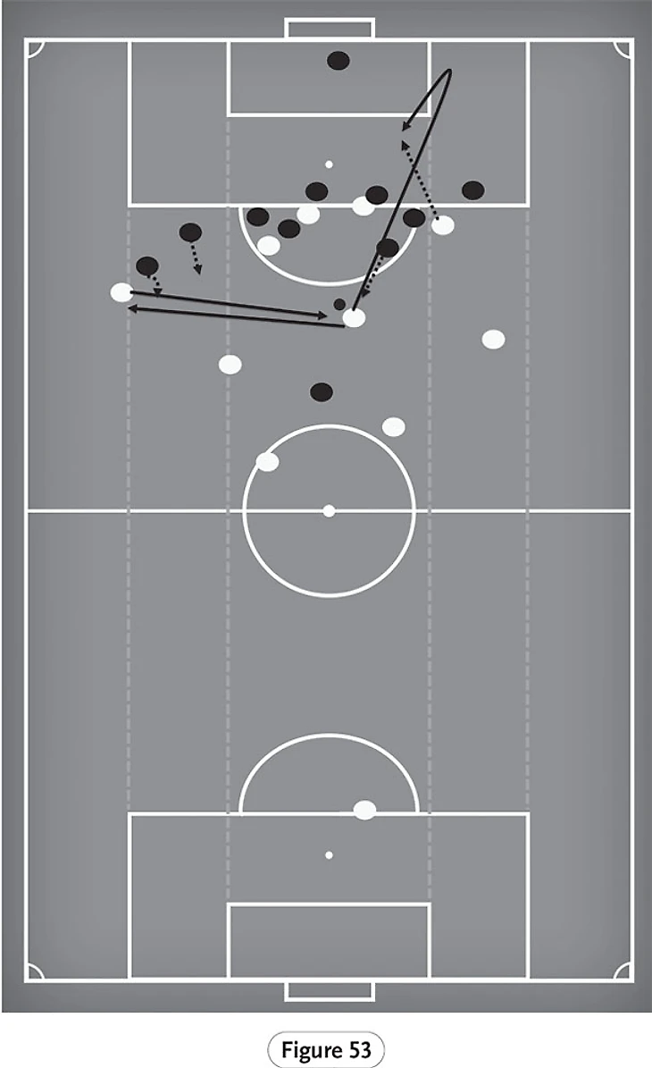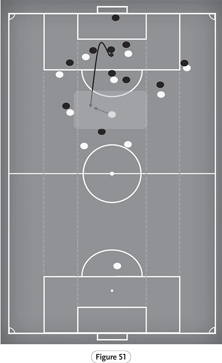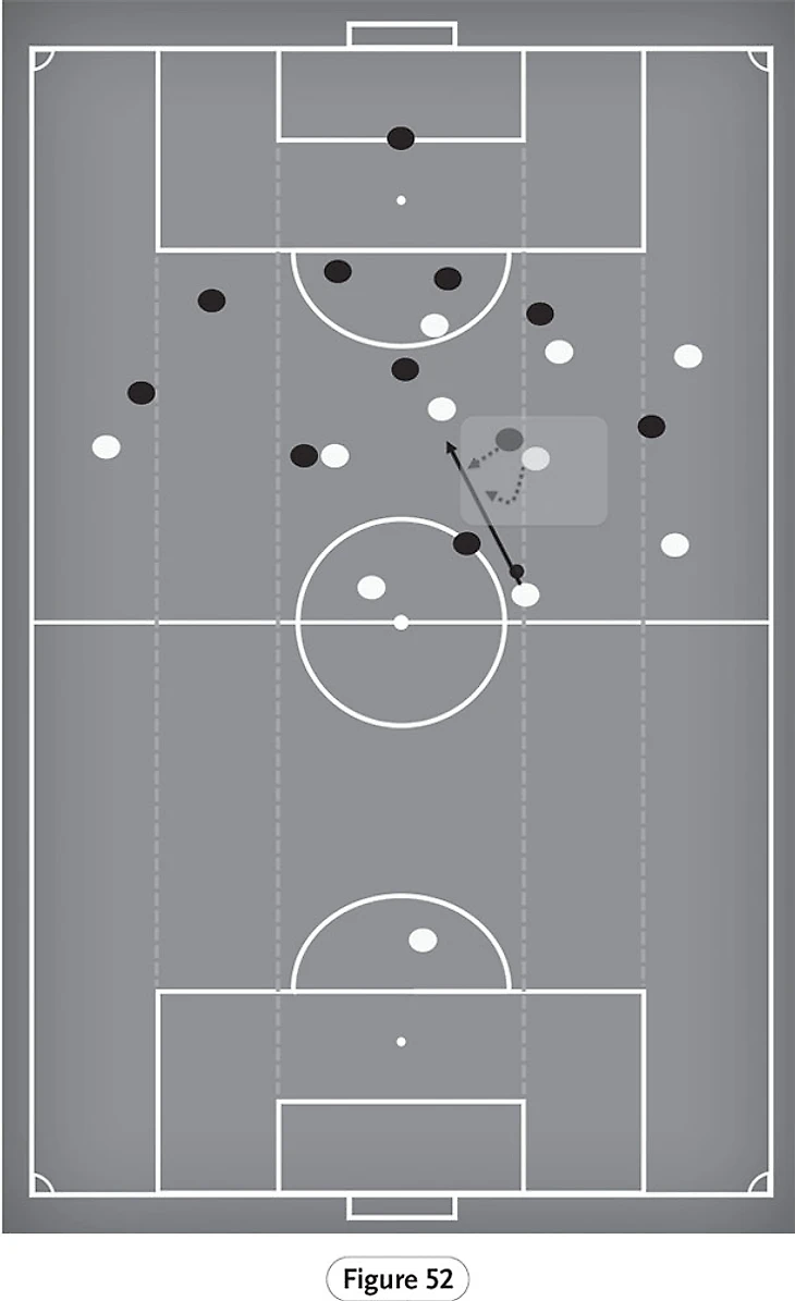 На рисунке 51 мы начинаем видеть пример того, почему Фабиньо является столь важным игроком для «Ливерпуля» с точки зрения обеспечения прикрытия для товарищей по команде, которые регулярно выдвигаются на более высокие позиции. Игрок сборной Бразилии обеспечивает отличную базу для атаки благодаря своей мобильности и дальнодействию, на котором он должен восстановить владение мячом, если сопернику удастся его отобрать. Это также распространяется на его способность занимать позиции, которые, все еще выступая в качестве основы для атаки, обеспечивают поддержку владеющему мячом игроку, позволяя направлять мяч назад, изменяя тем самым точку атаки.