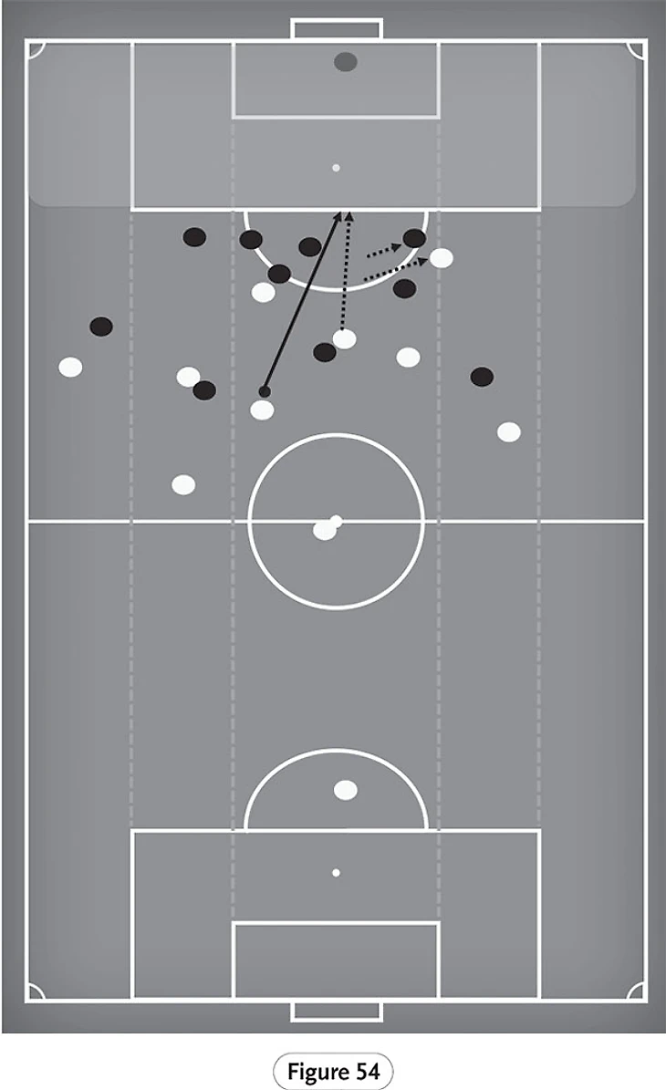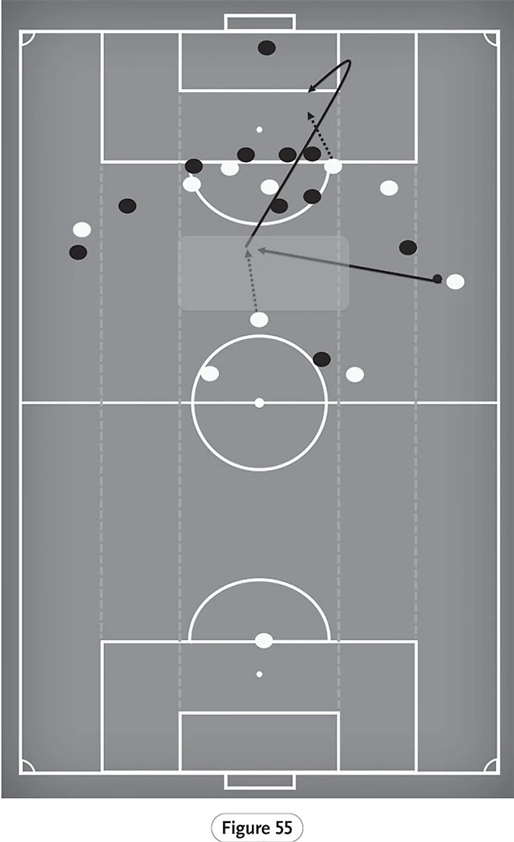 Мы видим это на рисунке 54, Фабиньо владеет мячом на краю последней трети. Одна из важнейших функций любого игрока полузащиты — разыгрывать пасы, которые разрывают линию обороны соперника. Это позволяет эффективно продвигать мяч вперед и создает перегрузки, которые могут разрушить оборонительную структуру противника.