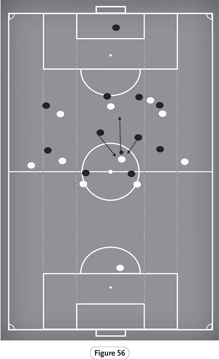 Мы видим наглядный пример этого на рисунке 56, когда Фабиньо владеет мячом в центре поля. Два игрока соперника прессингуют игрока с мячом и хотят атаковать Фабиньо. Игрок сборной Бразилии, однако, чувствует себя комфортно под давлением, и прорывается мимо обоих игроков и выходит за пределы четверых игроков в линии полузащиты. Это сразу же создает возможность для «Ливерпуля» перегрузить линию обороны.