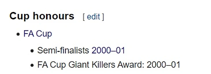 И да, «Уикома» в списке нет. Их удивительный поход до полуфинала Кубка Англии включал победы над «Вулверхэмптоном», «Уимблдоном» и «Лестером», но все это случилось до создания трофея Ронни Рэдфорда. Правда, в википедии «Убийца гигантов» все-таки есть в числе наград клуба.