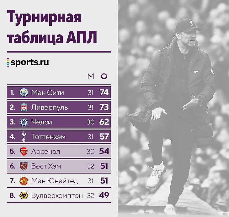 Что в таблице? У «Ман Сити» 74 очка, у «Ливерпуля» 73