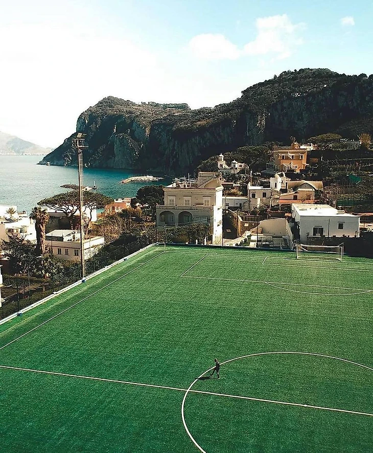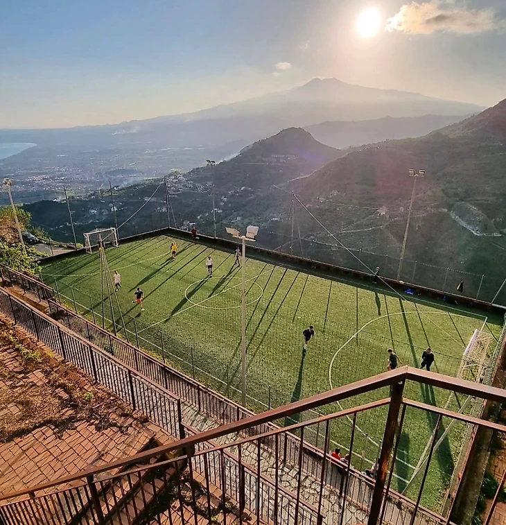 Итальянская деревушка Кастельмола с населением в 1 тысячу человек расположилась на высоте 550 метров — выше только горячее небо Сицилии. За каждым углом вы можете неожиданно увидеть что-нибудь интересное и необычное, например, вот такую шикарную футбольную площадку.