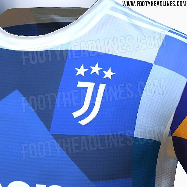 Четвертая футболка Adidas x Kobra Juventus 2021-22 имеет яркий геометрический рисунок с прямоугольниками и ромбами разных оттенков синего и желтого цветов как спереди, так и на рукавах.
