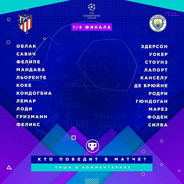 В составе Атлетико явных изменений по сравнению с прошлым матчем мы не заметим,но стоит нам взглянуть на состав Сити,как эти изменения бросаются в глаза.В первом матче Гвардиола выпустил 3 ярко выраженных центральных защитника( Аке,Ляпорт,Стоунз).Кансело же был не фланговым защитником,а латералем,наравне с Бернарду Сильвой.Но,что же было у Манчестера в этом матче? Здесь уже Пеп выпустил 2 центральных защитников(Ляпорт и Стоунз).Но,суть в том,что в первом матче Сити играли в 3 защитника,в уже в этом матче в 4 защитника в линию(Кансело-Ляпорт-Стоунз-Уокер).Центр поля у команд остался без изменений.Симеоне нападение оставил прежнее(Гризманн и Феликс),в то время,как испанский специалист выпустил вместо Стерлинга Фодена,который стал играть роль ложной девятки.
