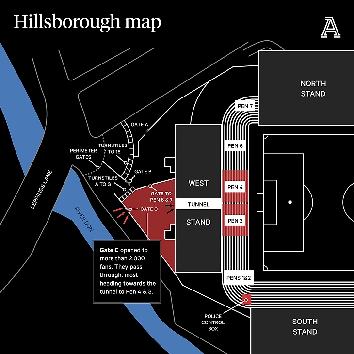 Полиция обвинила болельщиков «Ливерпуля» в том, что они толкали ворота, хотя на самом деле с диспетчерской вышки начальника матча, выходящей на загон, поступил приказ открыть ворота и ослабить давление. Оказавшись на территории стадиона, там не было ни полиции, ни стюардов, ни знаков, указывающих болельщикам не входить в и без того стесненно-переполненный загон.