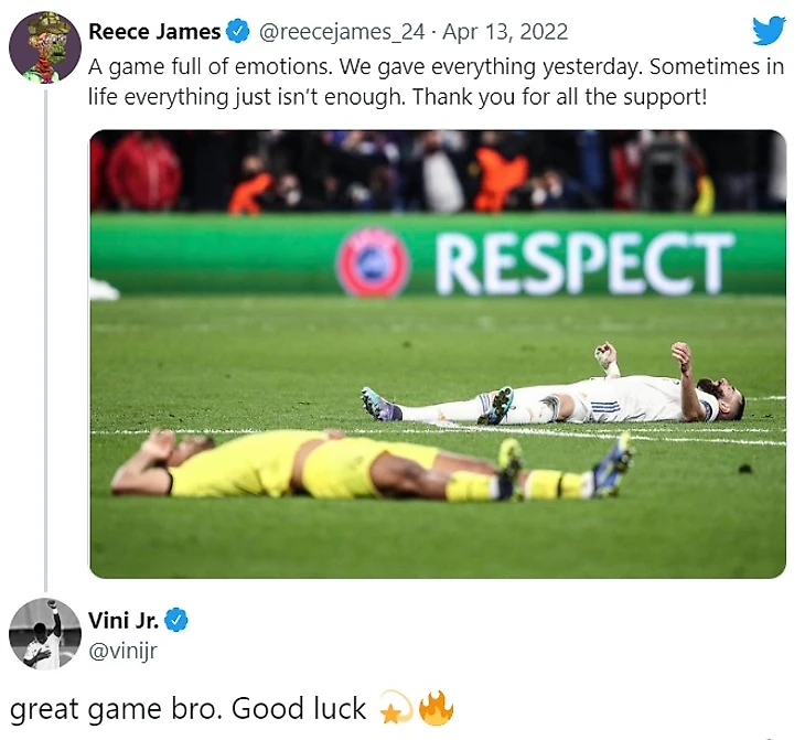 Форвард «Реала» Винисиус Жуниор похвалил защитника «Челси» Риса Джеймса после драматической победы в четвертьфинале Лиги чемпионов.