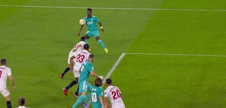 Для «Реала» все могло бы быть еще проще, если бы не вот такая ВАР-отмена гола. Еще при 1:2 вроде бы сравнял Винисиус – но вопросы вызвала его обработка. Он принял мяч так:
