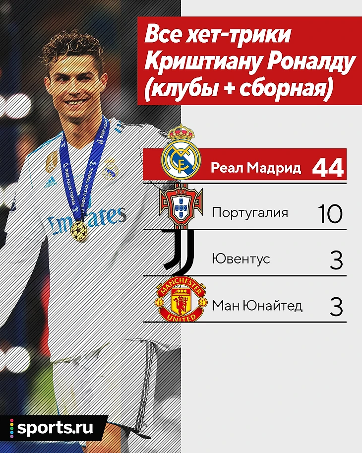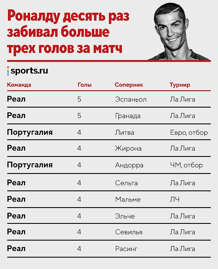Статистика хет-триков включает матчи, в которых Роналду забил 3 и больше мячей. Десять раз Криштиану не останавливался на трех голах.